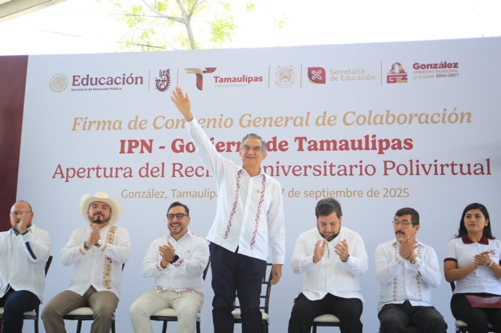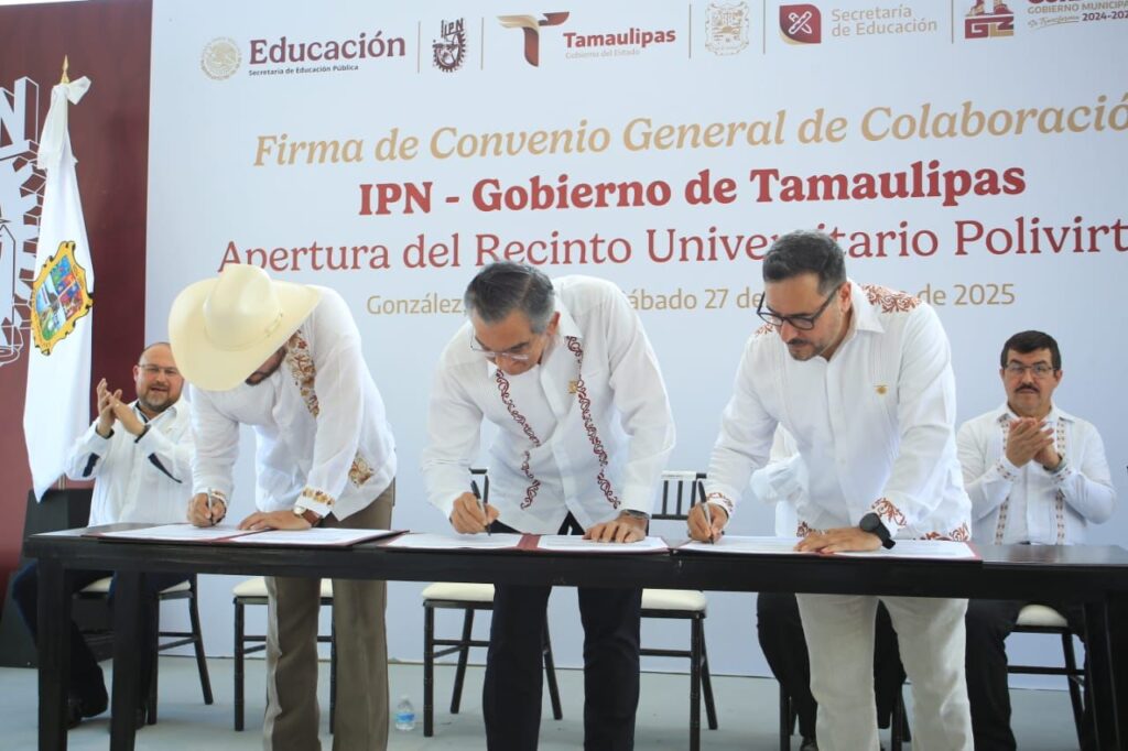 González, Tamaulipas. – El gobernador Américo Villarreal Anaya firmó el convenio de colaboración con el Instituto Politécnico Nacional e inauguró el Recinto Universitario Polivirtual, una nueva plataforma académica con la calidad y la excelencia educativa que distingue a esta prestigiada institución y que, por primera vez, se pone en marcha en todo el país.
