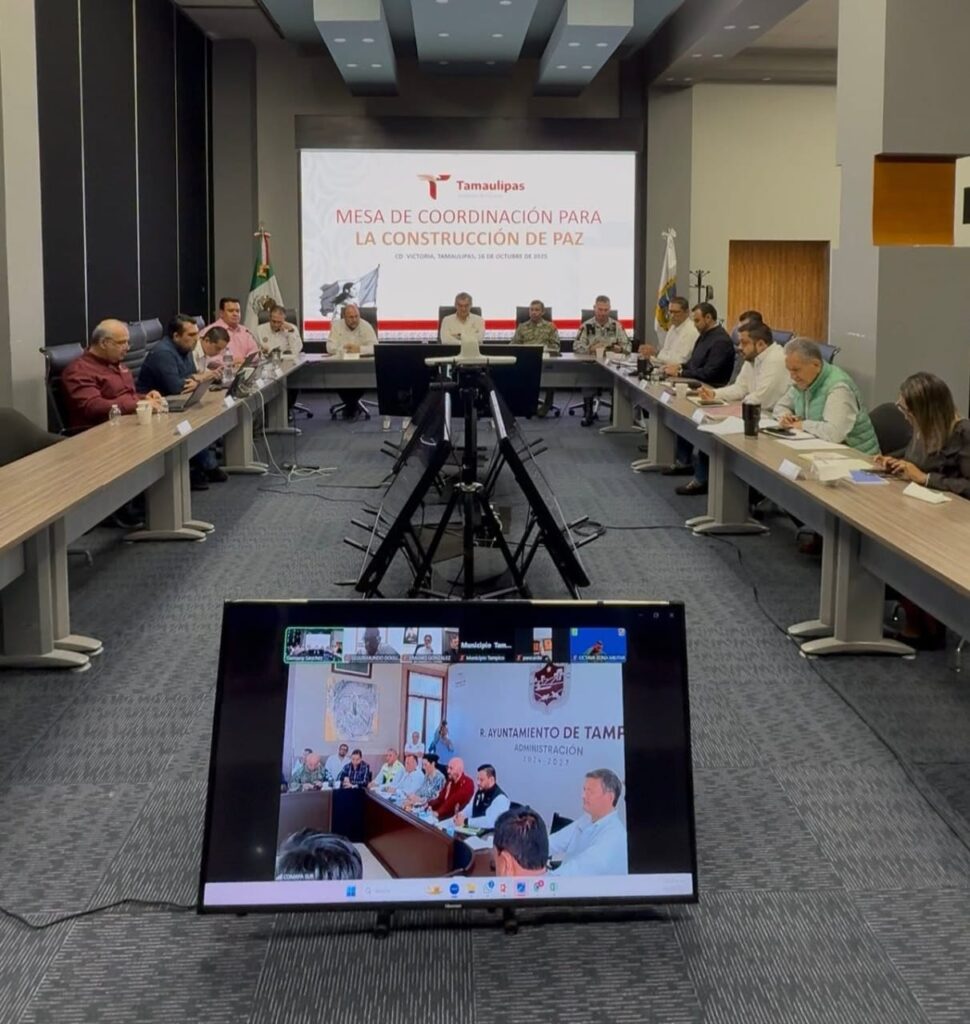 Durante la Mesa de Coordinación para la Construcción de la Paz, realizada en el C3 de esta capital, el mandatario tamaulipeco sostuvo una reunión virtual con el Consejo Municipal de Protección Civil de Tampico, encabezado por el secretario de Recursos Hidráulicos, Raúl Quiroga Álvarez; el coordinador estatal de Protección Civil, Luis Gerardo González de la Fuente; y la presidenta municipal, Mónica Villarreal Anaya, además de representantes de las Fuerzas Armadas, dependencias federales y los ayuntamientos de Madero y Altamira.