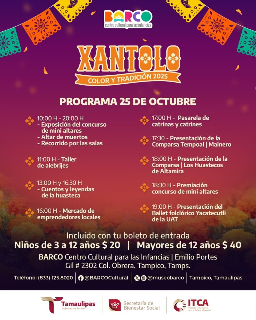 Entre las actividades más esperadas de la época y que se realizarán en BARCO, destaca el Xantolo 2025, en donde habrá presentación de las comparsas Tempoal Mainero y Los Huastecos de Altamira, el Ballet Folclórico Yacatecutli de la UAT, talleres de arte, cuentos y leyendas de la huasteca, así como un mercado de emprendedores locales que llenará de vida el recinto.