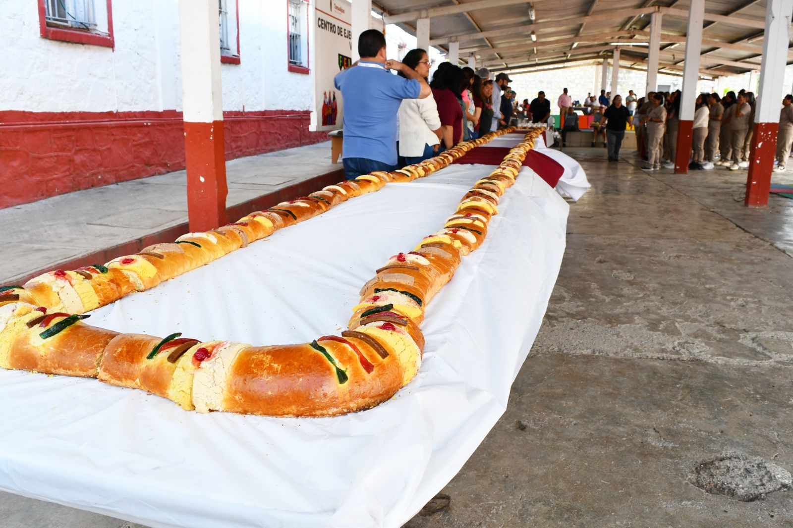 Ciudad Victoria, Tamaulipas.- Siguiendo la tradición anual en el Centro de Ejecución de Sanciones (CEDES) de Ciudad Victoria, personas privadas de la libertad (PPLs) y sus familias compartieron una mega Rosca de Reyes, elaborada por la población penitenciaria laboralmente activa en el área de panadería.