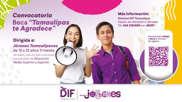 Ciudad Victoria, Tamaulipas.- El Sistema para el Desarrollo Integral de la Familia de Tamaulipas, presidido por la doctora María de Villarreal, a través de la Dirección de Fortalecimiento Familiar, invita a la juventud tamaulipeca a participar en la convocatoria de la beca “Tamaulipas te agradece”.