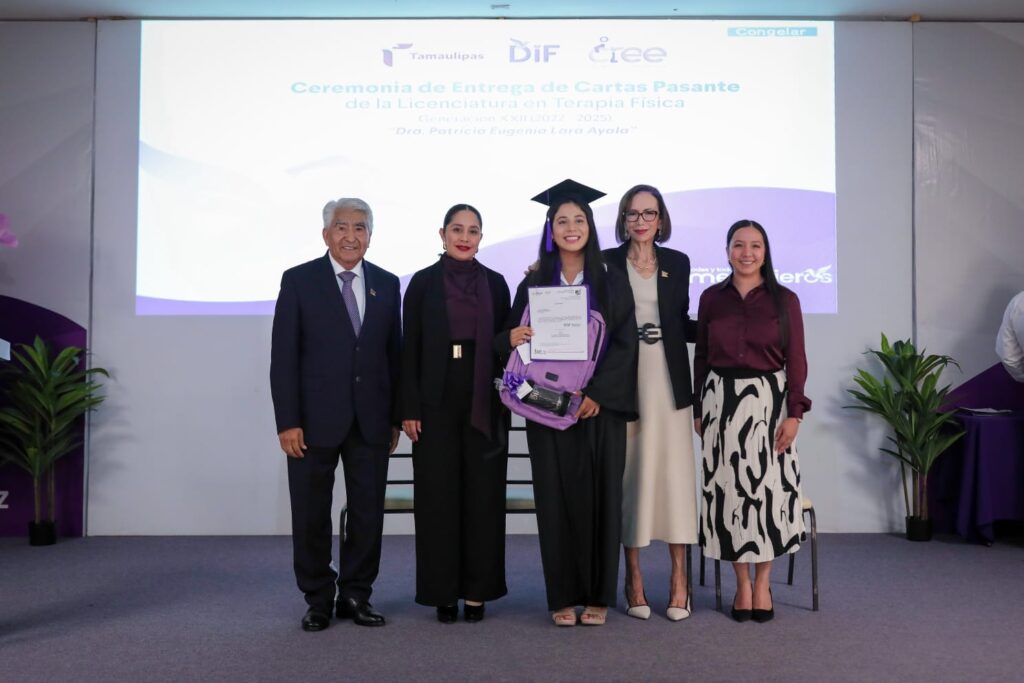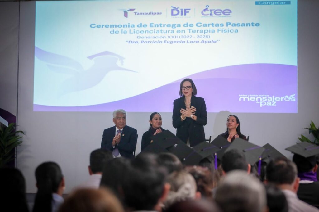 “En la construcción del Tamaulipas humano que encabeza nuestro gobernador, el doctor Américo Villarreal Anaya, y la doctora María de Villarreal, la labor del terapeuta físico tiene un papel esencial. Sabemos que esta profesión se fundamenta en el servicio humanista, pues su trabajo va más allá de prevenir y atender la salud: son una luz de esperanza para quienes viven alguna discapacidad y buscan, a través de la rehabilitación, su inclusión social”, mencionó la directora general del DIF Estatal, Patricia Lara Ayala, quien además fue distinguida como madrina de la generación número 22.