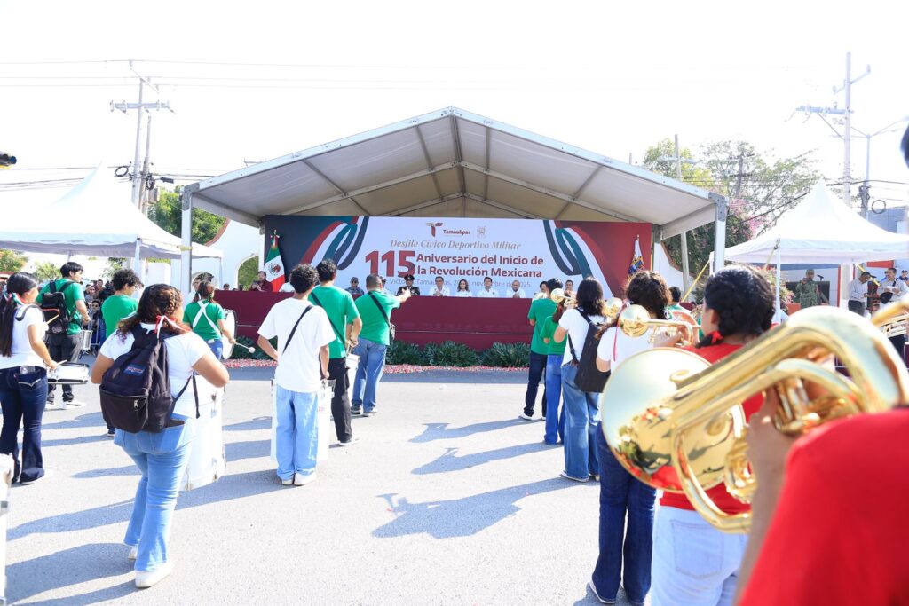 Ciudad Victoria, Tamaulipas.- Con la presentación, por primera vez, de una banda de guerra monumental integrada por 500 alumnos y alumnas de diferentes municipios, este jueves se conmemoró el desfile cívico, deportivo y militar, con la entusiasta participación de estudiantes, jóvenes, niñas y niños, en conmemoración del 115 aniversario del inicio de la Revolución Mexicana, presidido por el gobernador Américo Villarreal Anaya.