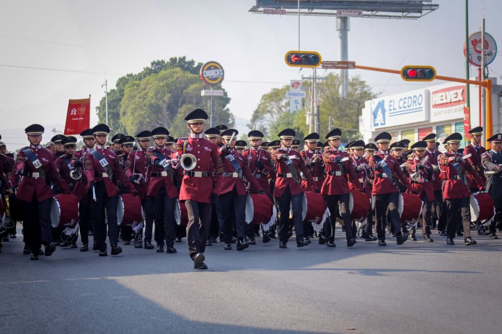 Ante la algarabía de miles de familias que se dieron cita para aplaudir el paso de los contingentes, también se sumaron 20 bandas de guerra, 54 conscriptos del Servicio Militar Nacional, 400 elementos de Protección Civil Estatal, 40 elementos de la Cruz Roja Mexicana y 13 cabalgantes.