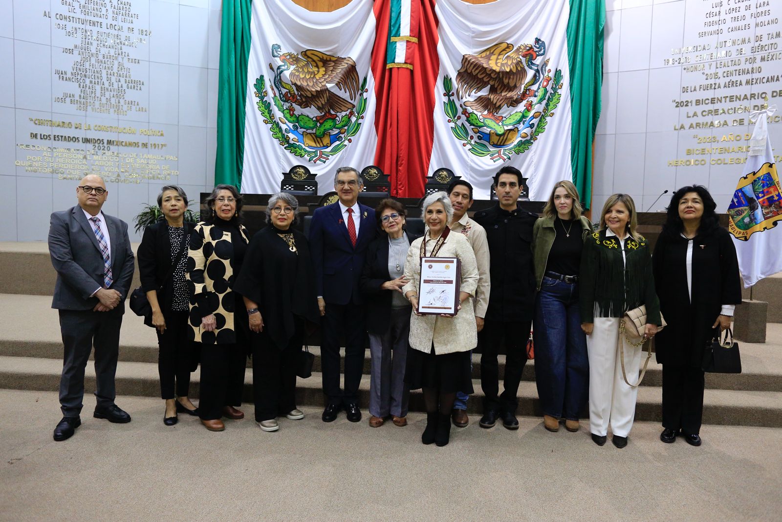 “Nos sentimos muy orgullosos de usted, de su obra, de su ejemplo, de su determinación para brillar y de llevar con usted a cada escenario, a cada aula, a cada recinto cultural, a cada estreno, la identidad y el orgullo de ser tamaulipeco”, expresó el gobernador en la ceremonia celebrada en la sede del Congreso Local.