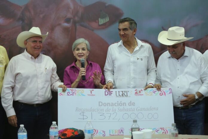 Ciudad Victoria, Tamaulipas.- Los ganaderos de Tamaulipas entregaron al gobernador Américo Villarreal Anaya y a la presidenta del DIF Estatal, doctora María de Villarreal, un donativo de 1,372,000 pesos en beneficio de los programas de esta noble institución. El donativo es el resultado de la gran subasta ganadera realizada este sábado, en el marco de la Feria Tamaulipas 2024.